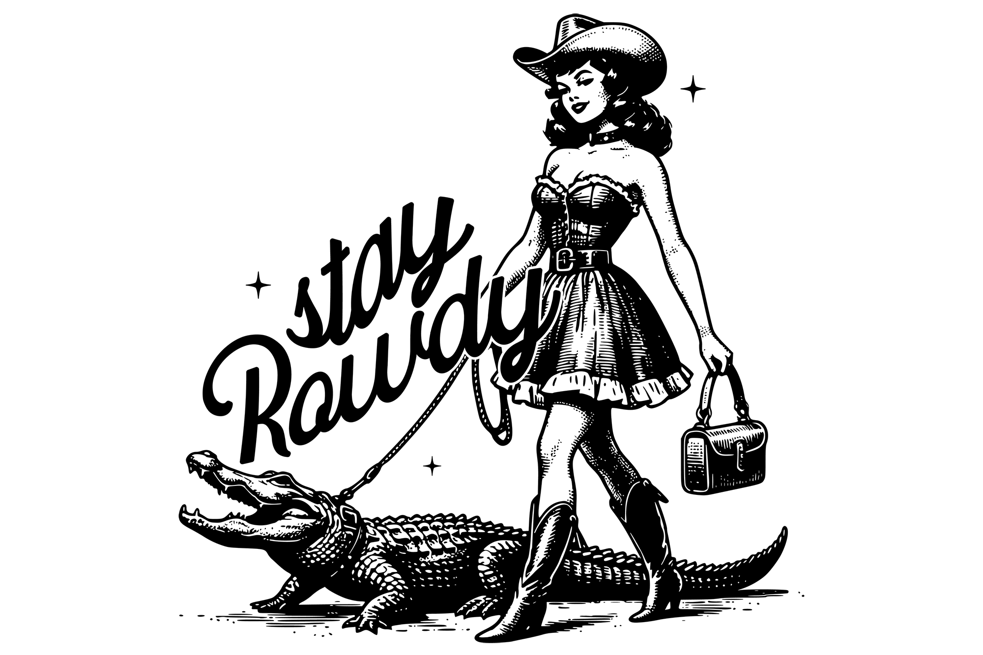 Stay Rowdy Cowgirl walking an alligator on leash